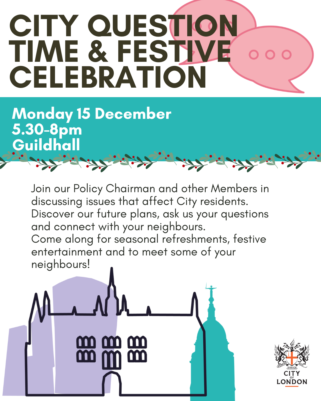 We’re hosting our next City Question Time for residents on Monday, 15 December, at Guildhall, 17.30 to 20:00. There will also be a festive celebration. If you’d like to join us, please register here City Question Time & Festive Celebration – 15 December – Fill in form. We’d love you to join us.
